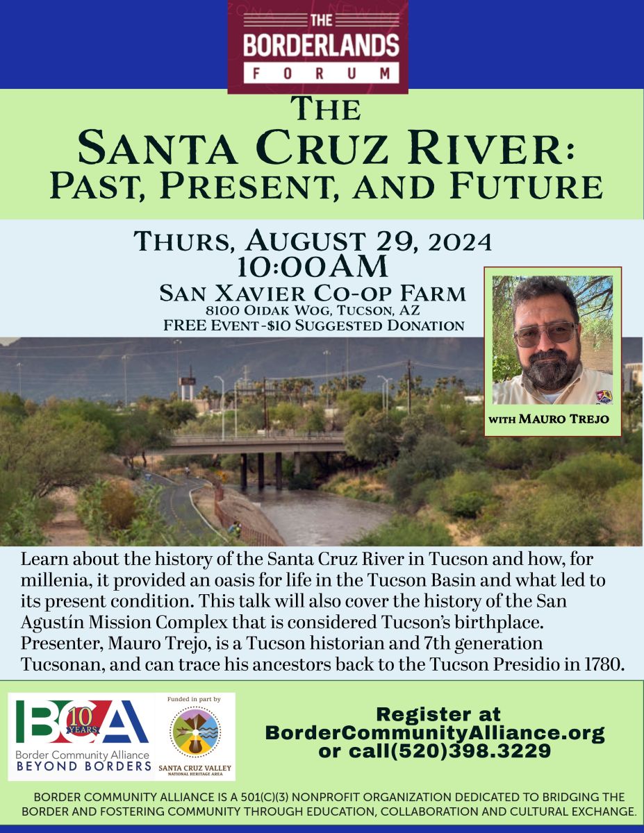 10:00AM Aug. 29, 2024, San Xavier Coop Farm. Learn about the history of the Santa Cruz River in Tucson and how, for millenia, it provided an oasis for life in the Tucson Basin and what led to its present condition. This talk will also cover the history of the San Agustín Mission Complex that is considered Tucson’s birthplace. Presenter, Mauro Trejo is a Tucson Historian and 7th generation Tucsonan, and can trace his ancestors back to the Tucson Presidio in 1780. FREE Event, Suggested Donation $10.