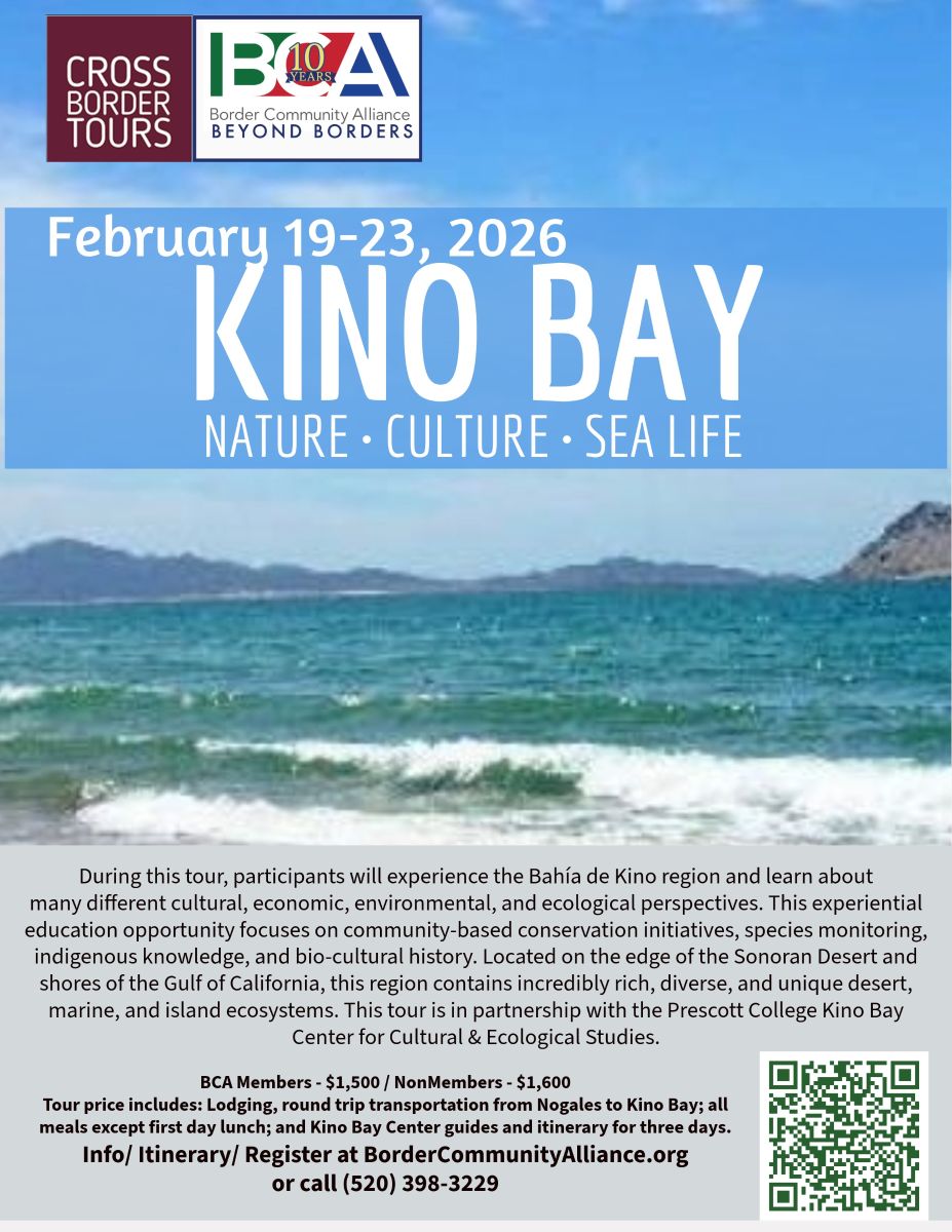 Cancellation Policy: If you cancel after the payment deadlines, we will not be able to refund your money unless there is a waiting list and your place on the trip can be filled by someone else. In this case, there is a $100 administration cancellation fee. WE STRONGLY RECOMMEND THAT YOU BUY TRAVEL INSURANCE IN CASE YOU NEED TO CANCEL THIS TRIP. BCA has the right to cancel the tour at any time based on safety concerns in the Kino area. If the trip is canceled, a full refund will be made.