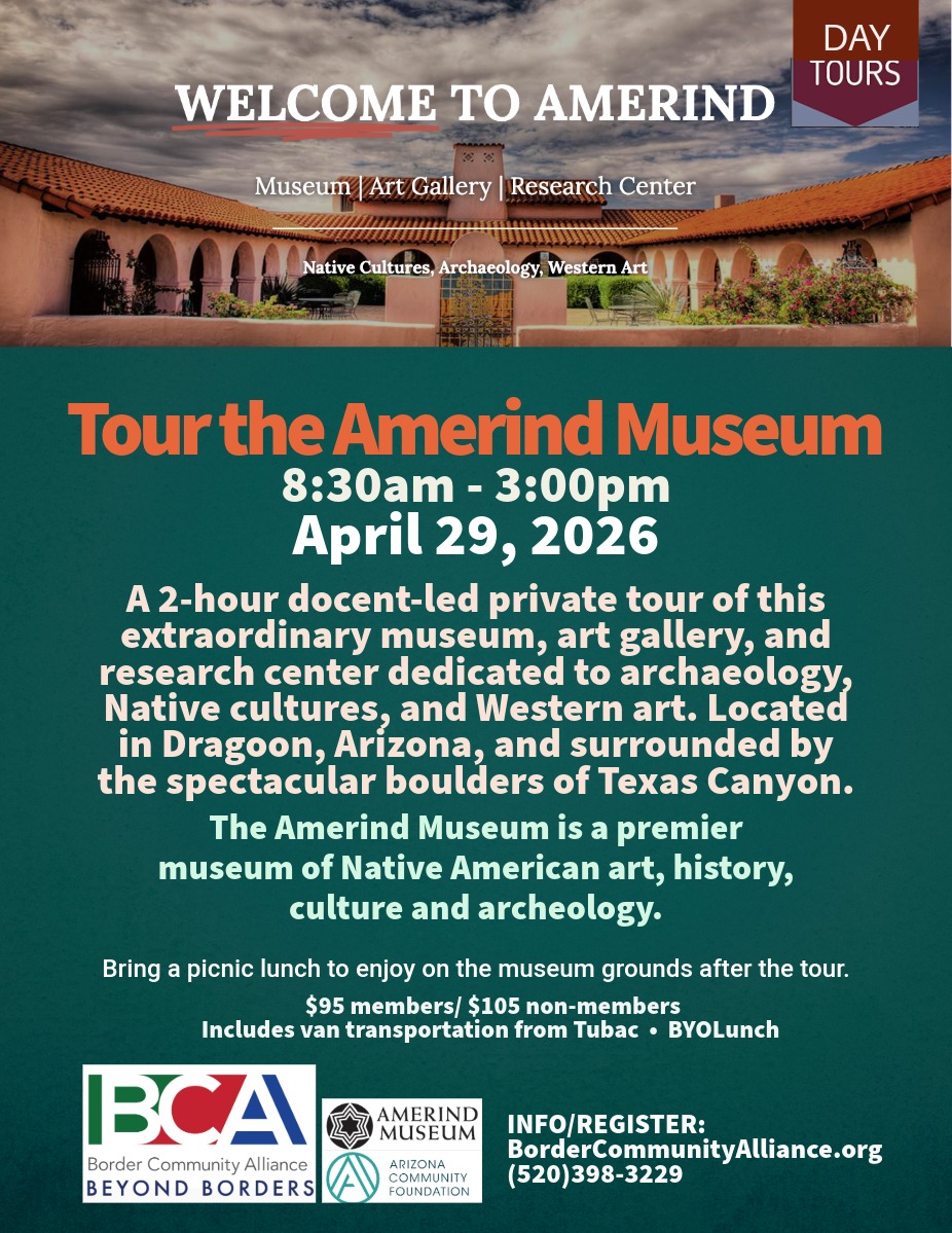 Tour fee: $95/BCA member; $105/non-member. Transportation from Tubac or Green Valley (depending on registrants' locations) included.